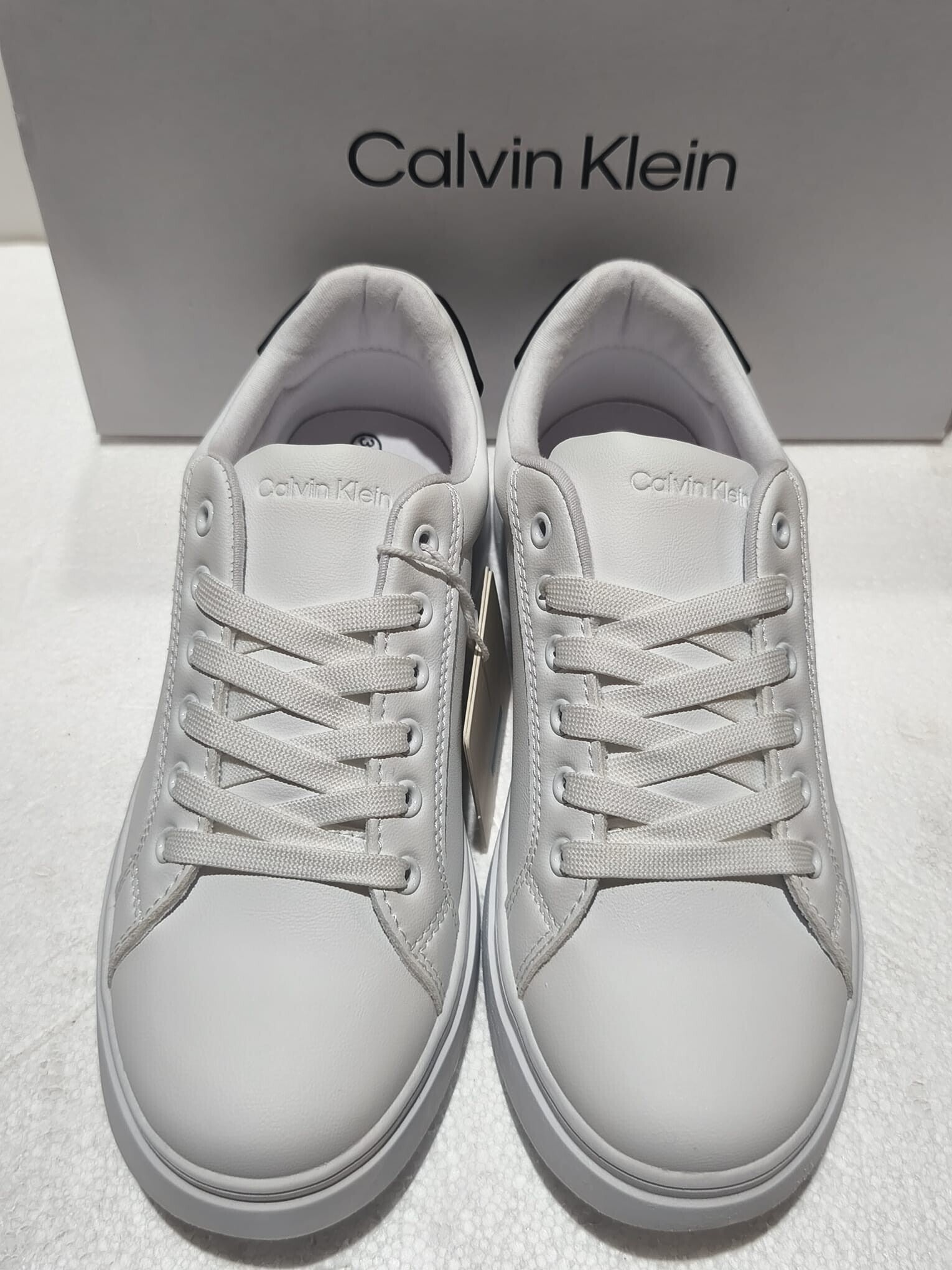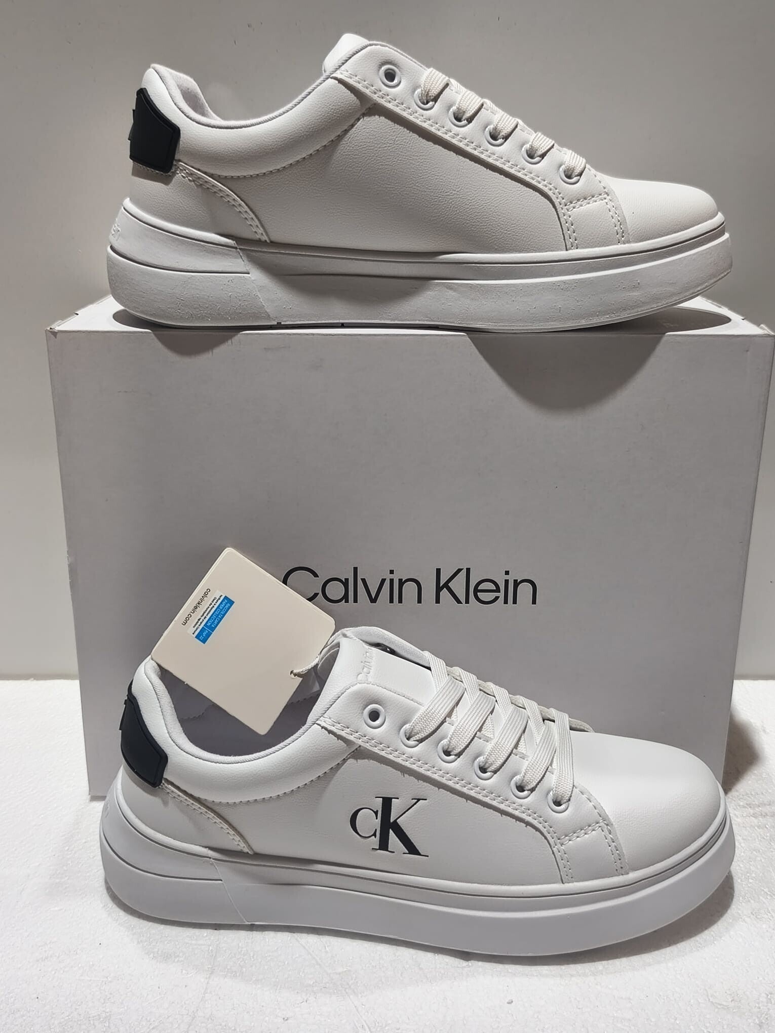 Dettagli di Stile: Inserto nero sul tallone con logo Calvin Klein impresso e linguetta logata per un riconoscimento immediato del brand.