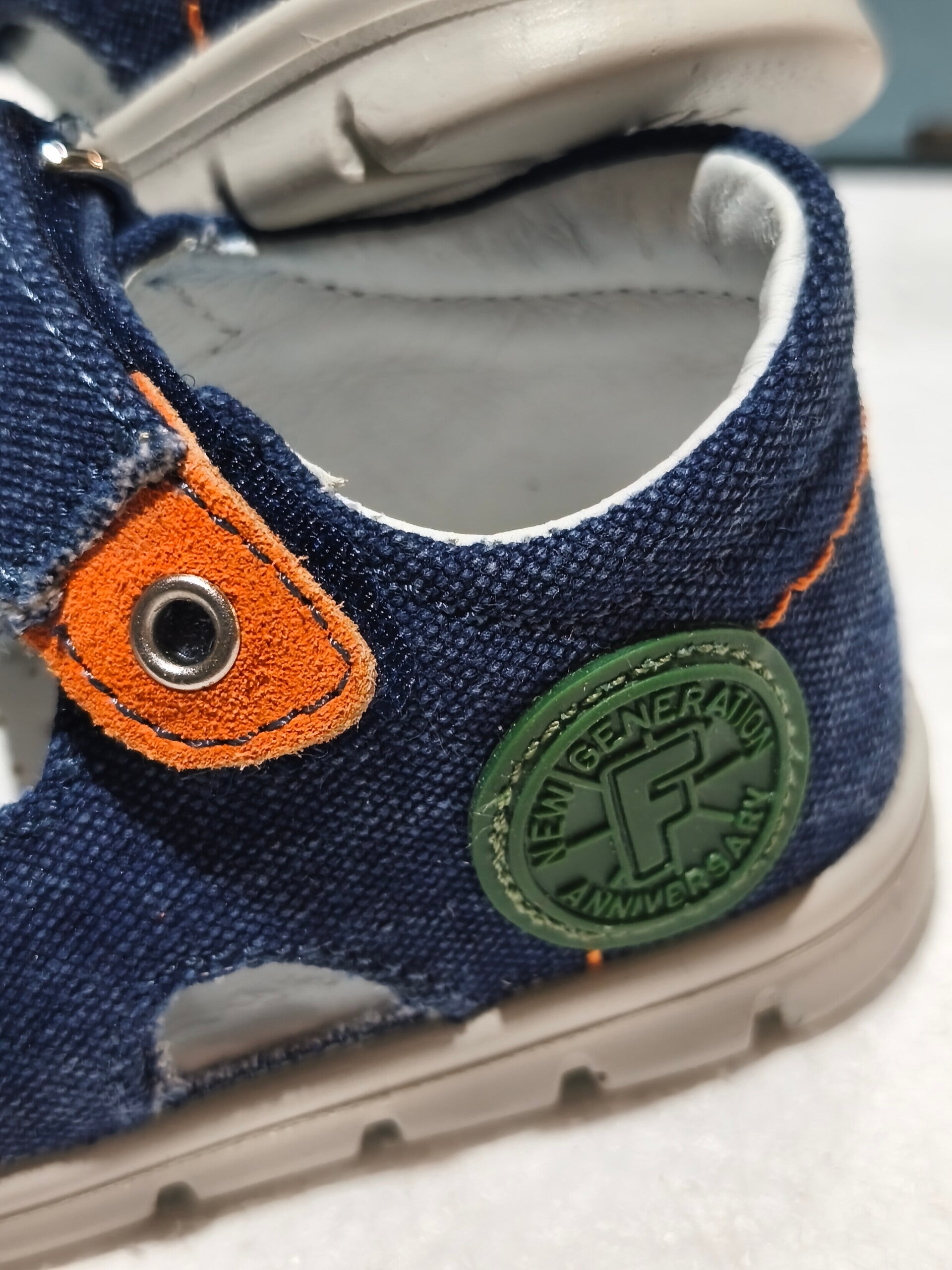 - Materiale Canvas Denim: Tomaia in resistente tessuto blu effetto denim, arricchita da impunture arancioni a contrasto e inserti colorati.