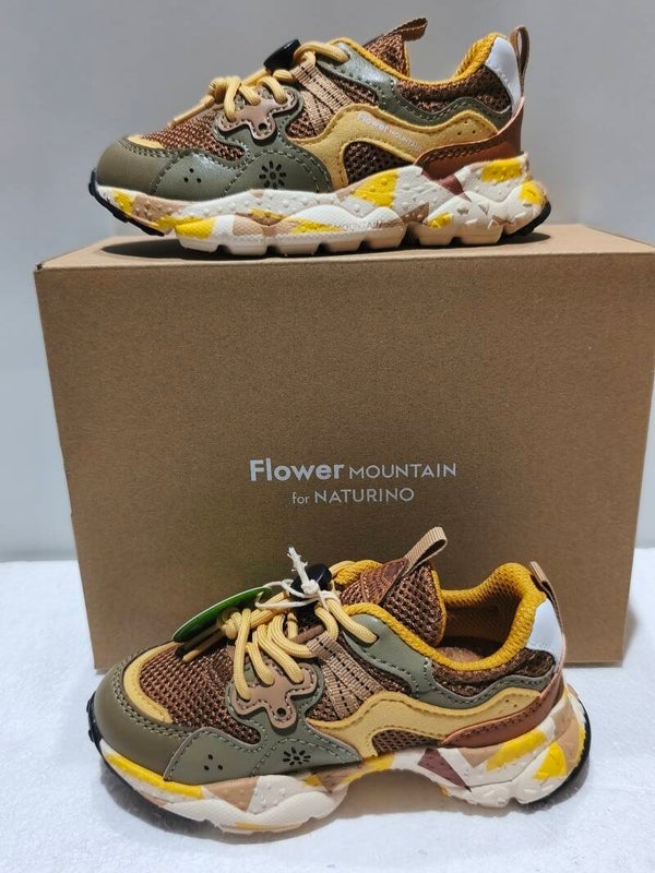 Grintosa e pronta a ogni sfida, questa versione della sneaker Flower Mountain for Naturino si ispira ai colori del trekking e dell'outdoor. Con la sua combinazione di tonalità fango, ocra, marrone e una suola dall'effetto "camouflage", è la scarpa ideale per i bambini dallo spirito avventuroso che amano esplorare con stile.
