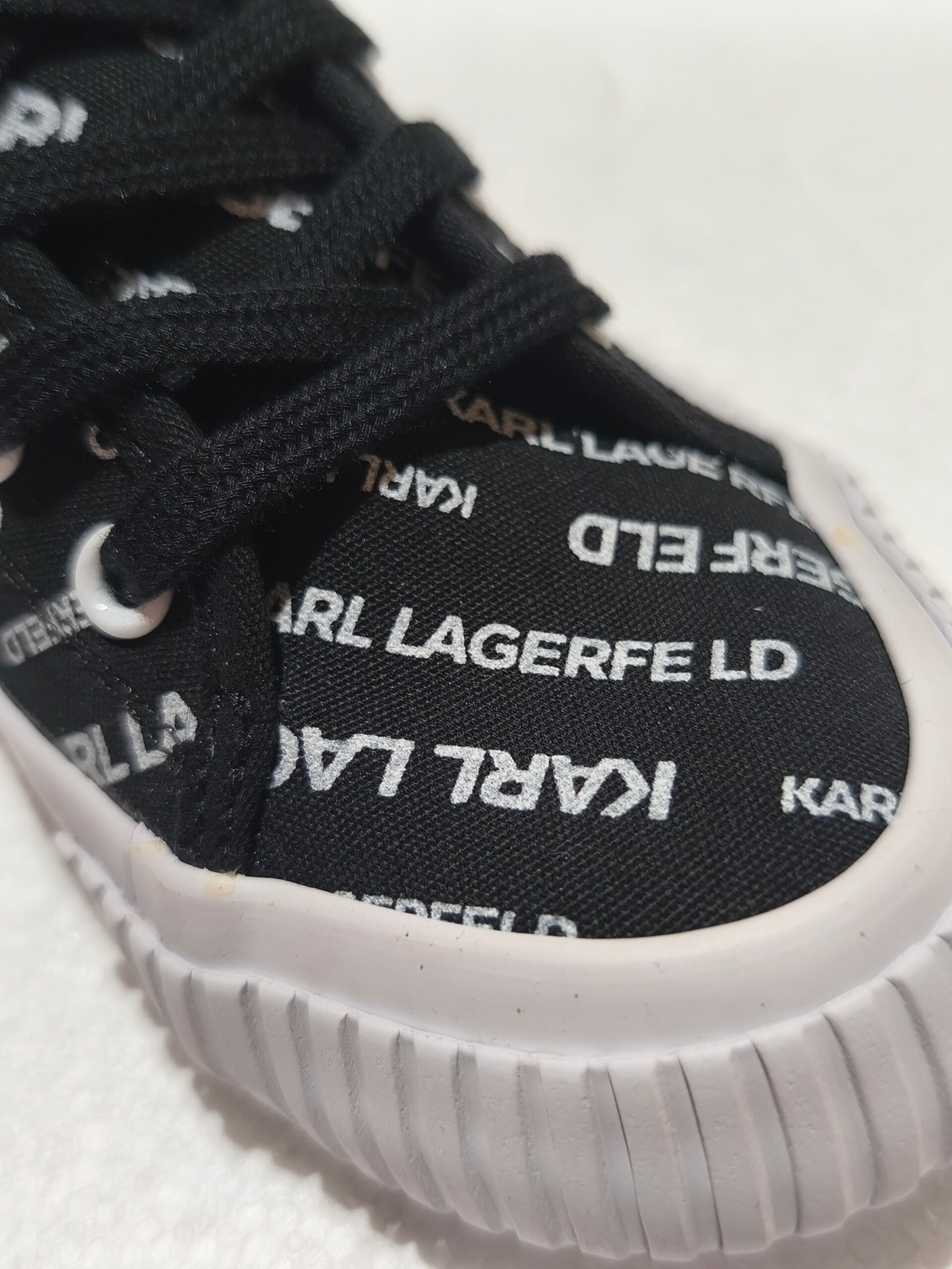 Logomania Chic: Tomaia in robusto canvas nero interamente decorata con il logo "KARL LAGERFELD" bianco a contrasto, per un riconoscimento immediato del brand.