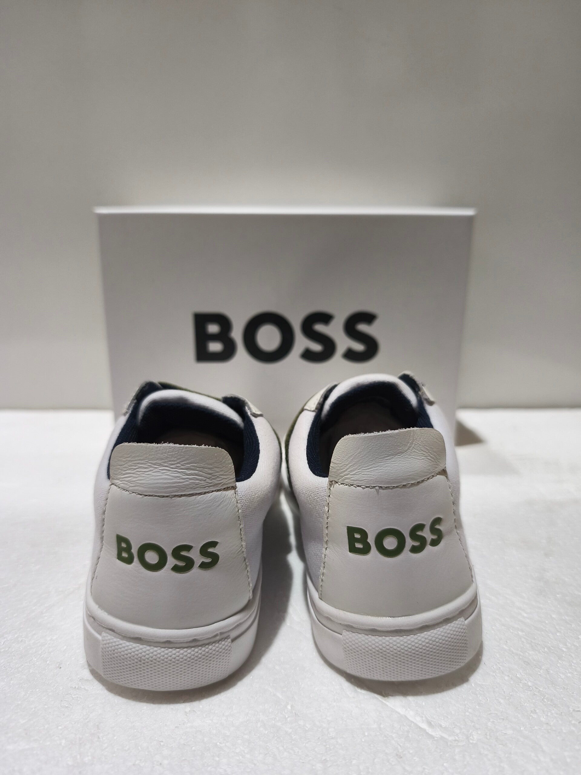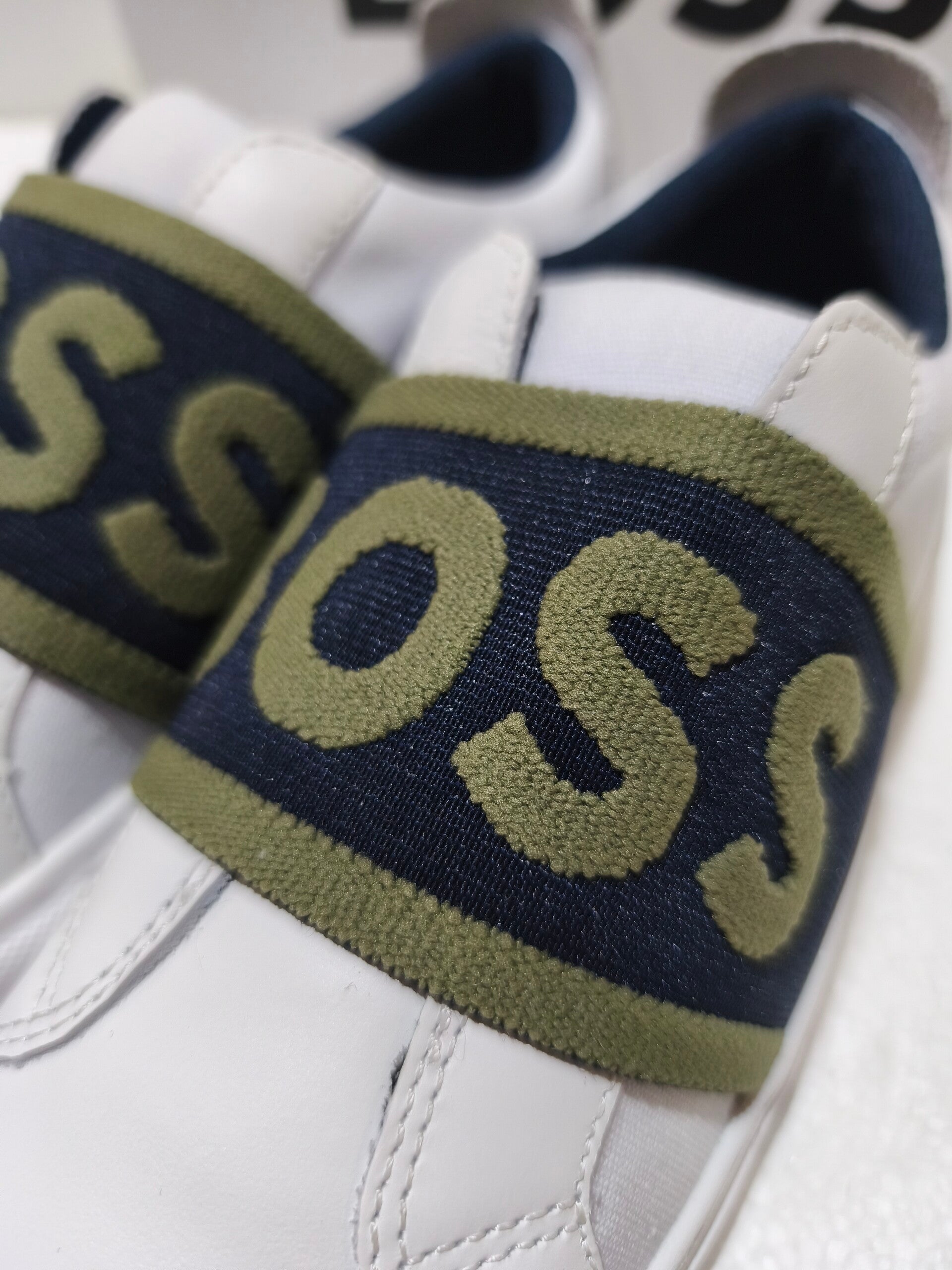Logo Iconico: Maxilogo "BOSS" testurizzato in rilievo sulla fascia elastica verde oliva e logo a contrasto sul tallone.